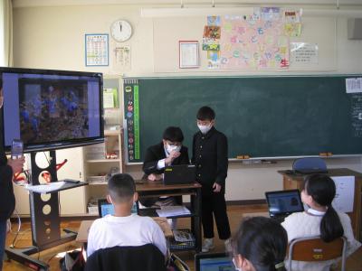 5年生は、学校の様子や行事の写真を何枚か選んで、動物のキャラクターに様子を説明させるプログラミングでした。