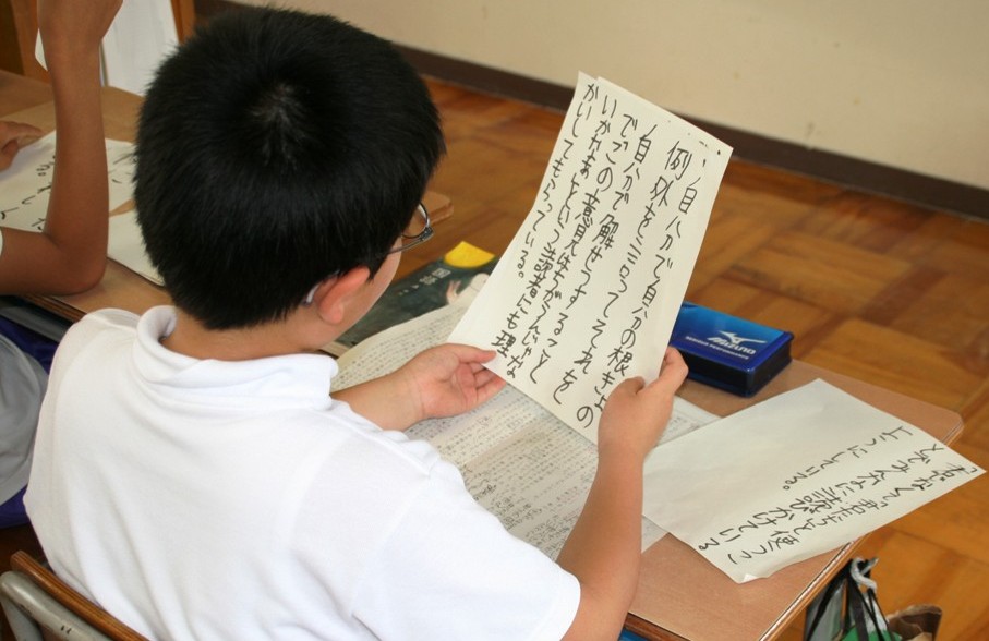 連日の猛暑です。登校してきた子ども達は朝から,頭がびっしょり汗で濡れています。教室はクーラーがないので,扇風機を回して授業をしています。大好きなプールも今日は,お風呂のようにぬるかったそうです。夏休みまであと2日,暑さに負けず子ども達は頑張っています。