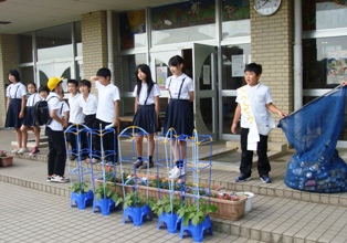 玄関前の1年生の朝顔が毎朝,色とりどりに咲き,目を楽しませてくれています。登校すると真っ先に水やりをする姿が見られます。2年生も野菜を育てています。ピーマン,ミニトマト,オクラ等が大きくなってきました。