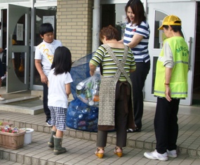 1年生はランドセルにカバーが     アルミ缶の入った袋を手に