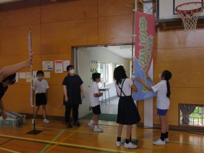 児童が体育館に、事前に作ったちらしを貼ったり、持ってきていただいたのぼり旗を立てたりしました。