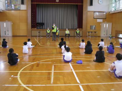その後、体育館に集まって、警察の方のお話をお聞きしました。