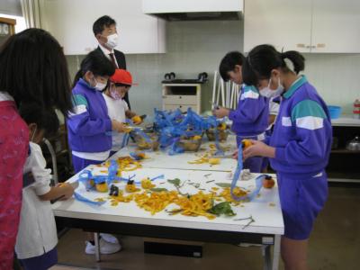 最近は落ち葉も増えてきて、1・2年生は生活科の時間に落ち葉や木の実を使って、「変身ベルト」や、さつまいものつるのリースを作って楽しみました。