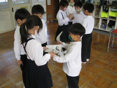 3~6年生が書いたメッセージカードを、5年生2名が代表として言葉を添えてお渡ししました。「My treasure.」と言ってくださいました。