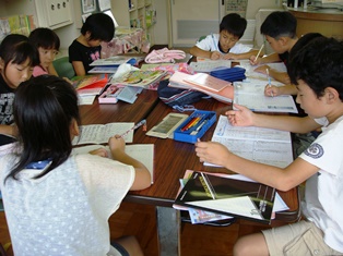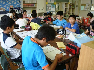 夏休みの図書室は大入り満員 投稿日時 : 2013/07/25 校長 夏休み期間に何回か、クーラーの効いた図書室を開放しています。 9:00~10:00に、勉強や読書に来ましょうと提案したところ、1年生から6年生まで大勢の子が夏休みの宿題を持ってきて、机や椅子が足りないほどになりました。誰も遊ぶ子はおらず、せっせとドリルや課題をしていました。帰りには、借りていた本を返し、新しい本を借りて帰っていきました。5、6年生は、その後、ブラス練習をしました。 午後からのプールにもたくさんの子が参加していました。 Tweet {{options.likeCount}} {{options.likeCount}} 0 コメント