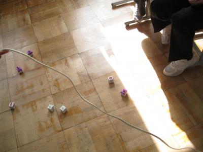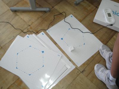 5年生は、トイオのキューブが正多角形の線の上を正しく動くように、曲がる角度や進む距離をプログラミングしました。