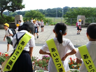挨拶運動 (直下町) 投稿日時 : 2013/07/03 校長 昨日は,直下町の児童が早めに登校して,玄関前で「おはようございます」と元気に挨拶を呼びかけました。 7月になり,暑くなってきました。児童の登校の様子も,階段や坂道を登ってくるため,汗びっしょりになっています。 学校に着くと,水筒のお茶を飲んで,一息してから,朝顔やミニトマトに水やりをしています。 ぐんと成長した植物は,毎日水やりをしないと,葉がしおれてしまいます。 日照り続きの時は,下校時にもう一度水をやって帰ります。 Tweet {{options.likeCount}} {{options.likeCount}} 0 コメント