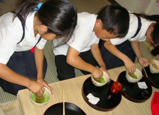 4年生 学校茶道 投稿日時 : 2013/07/05 校長 茶道の先生をお招きして,4年生が茶道を習っています。 少し狭いですが,本校に唯一ある8畳の和室で行っています。 床の間には,先生が持参してくださったお茶花が美しく飾られます。 4年生は,季節の和菓子を目で楽しみ,自分たちでたてたお茶をいただきます。 今回は,七夕にちなんだお菓子でした。 Tweet {{options.likeCount}} {{options.likeCount}} 0 コメント