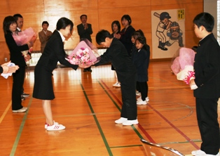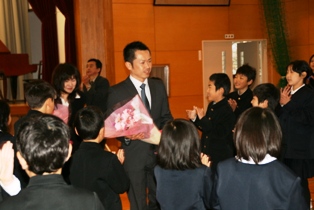 離任式で最後のお別れと感謝 投稿日時 : 2013/03/29 校長 今日は離任式をしました。春休み中だった児童や卒業生も,久しぶりに登校してきました。 お別れは悲しいのですが,5年生は,一人一人の先生に,心を込め感謝の言葉を述べました。先生方からも,児童に最後の挨拶を頂きました。どこに行かれても,同じ県内の空の下なので時々は三谷小学校のことを思い出し,新天地でもご活躍されることを期待しています。 これまで,ありがとうございました。 離任される4人の先生を紹介します みんな真剣に聞いていました 怪我をしたとき,優しく手当してくださってありがとうございました 次の学校でも,がんばってください 校歌でお別れ「わが三渓の学舎に・・♪ ♫」 さようなら これからもお元気で 「三谷小! 最高!」 0 {{options.likeCount}} {{options.likeCount}}