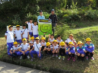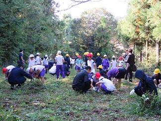 16日(金)大聖寺高校のエコプロジェクトのボランティア部員29名が本校の5・6年生とエコ活動を通して交流しました。この活動は、毎年この時期に行っています。運動場横の元のスキー場の歩道の草刈りやシイタケの原木の置き場所の整備もしました。その後、お互いの活動について話し、交流を深めました。
