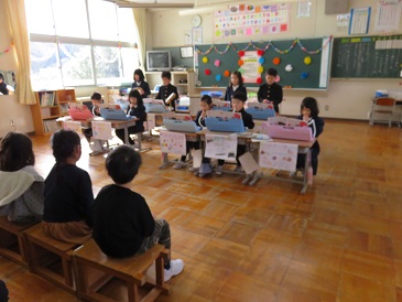 新1年生をむかえました 投稿日時 : 2019/02/19 校長 2月15日(金)に、1年生の子どもたちが、来年度入学する6人の園児の皆さんを招待して「新1年生をむかえる会」を開きました。子どもたちは、生活科の時間に計画を立て、準備・練習をしてきました。ちょうど1年前に自分たちがしてもらって楽しかった思い出があり、今度は自分たちがする番だということで、とても張り切ってすることができました。園児の皆さんが元気に入学するのを心待ちにしています。 0 {{options.likeCount}} {{options.likeCount}}
