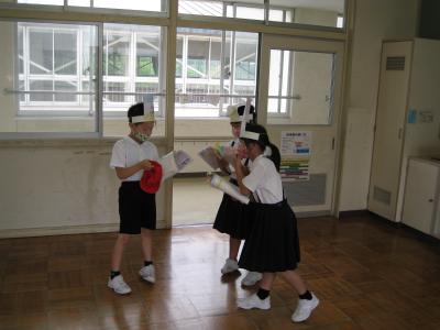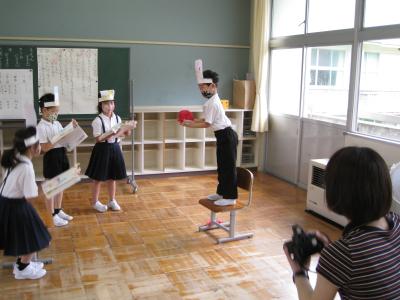 登場人物4人とナレーター役2人を決めて、読み方や動きを考えて練習し、1年生に発表しました。