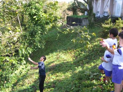 先日、教頭先生が竹の棒で柿をとり、1・2年生が受け取りました。