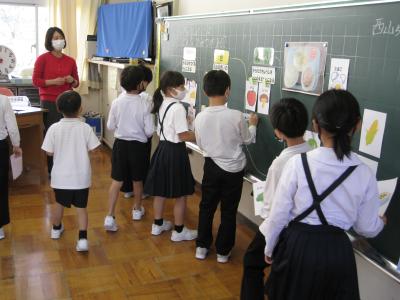1・2年生の学級活動の時間に、食育の授業を行いました。 給食の献立にはどんなひみつがあるかという学習でした。