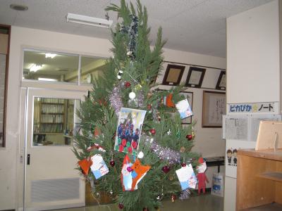 100円ショップで揃えた飾りをつけて、クリスマスツリーらしくなっていましたが、1・2年生が折り紙で、プレゼントを持ったサンタさんとトナカイを作り、サンタさんへのお手紙も書いて飾り付けたので、さらにかわいらしいツリーになりました。