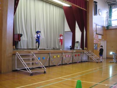 1・2年生の劇は「ももから生まれた6年生」で、6年生4人と鬼役の1・2年生がなわとびやリレーで対決する場面で盛り上がりました。替え歌のプレゼントもありました。