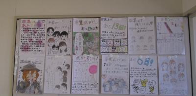 それぞれの思いを絵と言葉でかいてあります。毎日どんなものが貼られるか楽しみですが、やはり「卒業はうれしいけど、さびしい」という言葉が見られます。「だから1日1日を大切にしていこう」「今までお世話になった人に感謝しよう」とも書かれています。