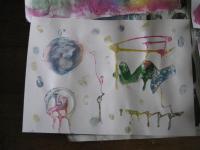 画用紙に液体のりを自由にたらし、チョークの粉をぼかし網で散らばせたり、指や木片で色を広がらせたりして、思い思いの作品を作っていました。