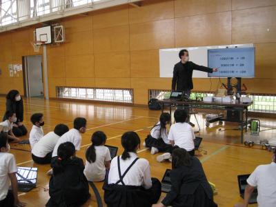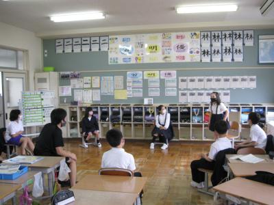 プレゼンテーションソフトで文字やイラストを見せながら、ところどころジェスチャーや5・6年生の反応の声も交えて発表してくれました。