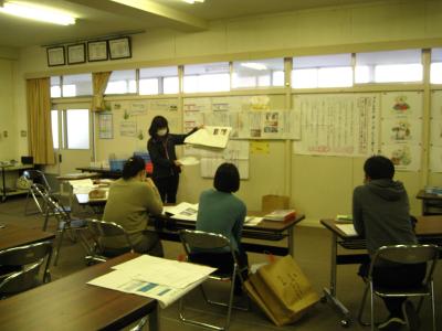 2学期の国語の単元から各先生が1つ選び、学習のねらいや指導のポイント、子どもたちがつくった成果物、成果や課題などを伝え合いました。