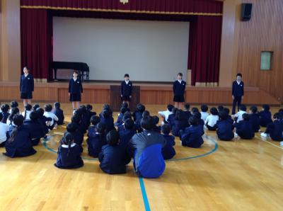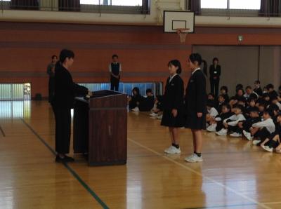 児童の作品の表彰のあと、後期児童会役員の任命集会が行われました。後期委員長の所信表明を全校で聞きました。みんなでウエルビーイングな学校を創ることを確認しました。