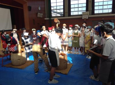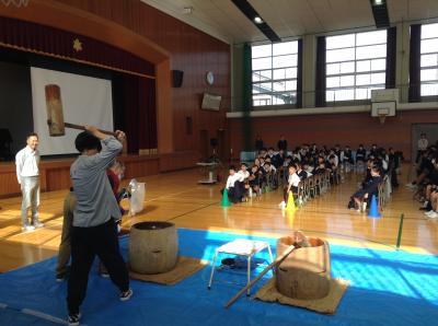 5年生の米作りの学習で、収穫祭を行いました。今年は5年ぶりにもちつきも行い、ついたおもちを全校で食べました。6年生は昨年もちつきを行っていないので、今年は5,6年生でもちつきをしました。前日や当日の朝早くから準備をしてくださった、農誠会の方、JA、JA女性部、たくさんの方々のおかげでとてもいい収穫祭になりました。ありがとうございました。5年生の運営や発表もすばらしかったです。