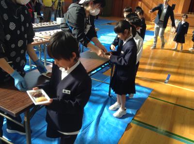 5年生の米作り体験でお世話になっているJA辰口からおにぎりをいただきました。5年生が代表でいただき、給食で全校児童がたべました。とてもおいしくいただきました。ありがとうございます。