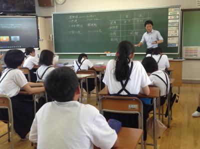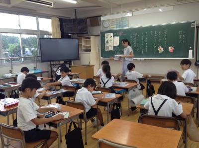 1年生の食育の授業の様子です。辰口給食センターから栄養士さんにきていただきました。