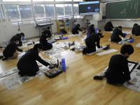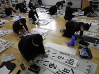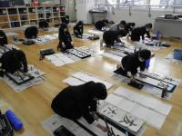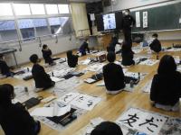 5年生の書写。2学期も終わりに近づき、3学期初めに行う「校内書き初めの会」の練習に取り組んでいます。いつもは机の上での毛筆が主ですが、書き初めならではの雰囲気に一人一人の心が引き締まる様子が伝わってきました。