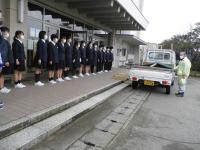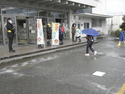 宮竹小学校の児童玄関には、能美市教育委員会の教育長さんが来てくださいました。「みーやん旗」をもって、自主的に加わってくれた6年生もいて、みぞれ混じりの寒い朝でしたが、心はじんわり温かくなり、笑顔が広がりました。
