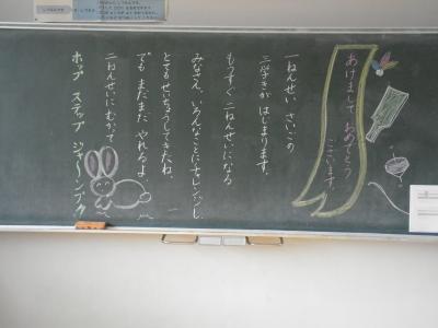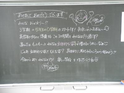 どの教室にも担任からのメッセージが記されています。3学期、仲間とともにより良い学校生活をめざしてチャレンジしていきましょう。3か月後には、新しい門出が待っています。3学期は、次学年の0学期ともいわれているくらい、短いけれど大切な楽器です。
