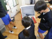 3時間目。理科室にたくさんの大人の方が…。子どもたち(4年生)は手袋をはめた手にドライバーを持ち、何と、パソコンを分解していました!