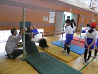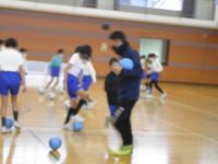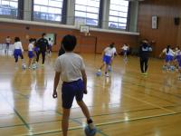 12月13日(月)体育館では、5・6年生が合同体育で室内サッカーの練習をしています。その中に、俊敏な動きの大人が二人…⁉ 県の事業「プロスポーツチームの方に学ぼう」という体験学習の一環として、フットサルチームの選手が指導してくださっていたのです。