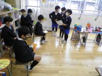 春のような日差しの中、4月から本校に入学予定の年長組のお子さんたちが学校にやってきてくれました。1年生たちは、今日のためにワクワクしながら準備をすすめてきました。