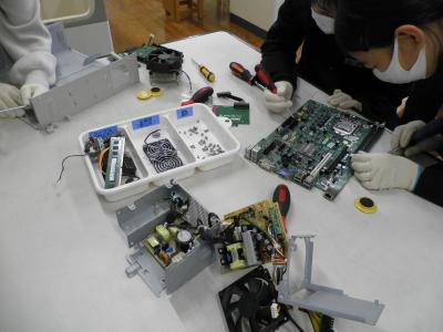 これは、金沢村田製作所による「出前授業」です。生活に欠かせない存在となってきたパソコンを分解し、精密なつくりを知るとともに、分解した部品はすべて分別し、リサイクルできることを学びました。