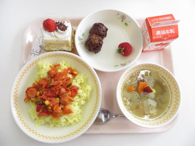 をいただきました。給食ではなかなか食べることができない生ケーキは、ふわふわでとても美味しかったです。