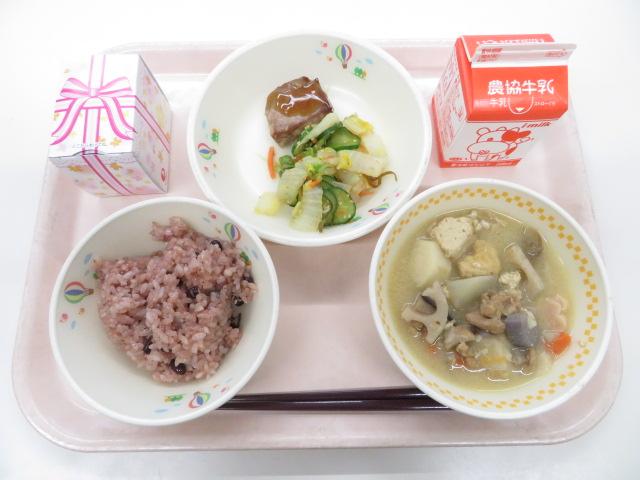 をいただきました。今日は6年生にとって小学校生活最後の給食です。給食は一生を元気で過ごすために大切な食事のお手本です。これから何をどれだけ食べればいいか考えるときに、ぜひ、給食のことを思い出してほしいです。
