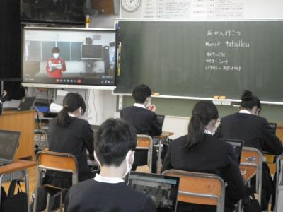 2月14日(月)3年教室では、クロムブックの向こうの誰かと交信中。