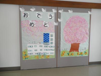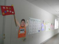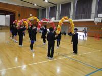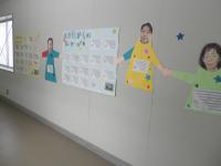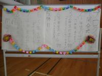 入場する渡りろう下には、子どもたちや職員一人ひとりからのメッセージが掲示されていました。体育館も4年生中心に飾り付けられています。