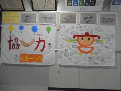 ↑6年生手作りの旗2枚。右の旗は、全学年の子どもたちと職員の寄せ書きです。