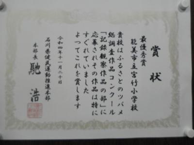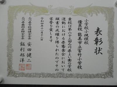 また、「石川県よい歯の学校運動」でも、小学校小規模校の部で「優良校」となりました。(県4位くらい)