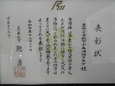 子ども消防学校での体験や能美市防災無線を使っての防火の呼びかけ放送など、様々な防火活動が認められたものです。(児童会の子どもたちが中心になって取り組んでいます)