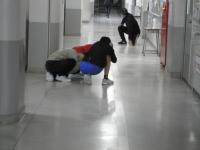 休み時間に突然の緊急放送。「地震です」の声に、驚きながらも身を低くし頭を守っています。高学年が小さい子に寄り添っている姿も。