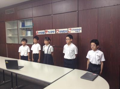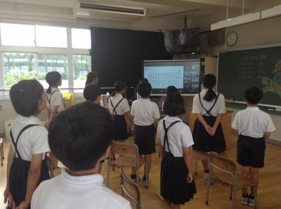 まずは2年生以上の代表のふりかえりと、校長、学習、メディアルール、夏休みの生活の話、最後に校歌を歌いました。