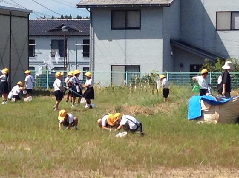 1年生は生活科の学習で虫探しました。横の畑に草むらがたくさんあり、みんなで見つけました。見つけた虫はしばらく虫かごに入れて観察しました。虫かごの環境を整えることも考えていましたね。