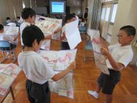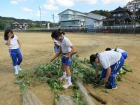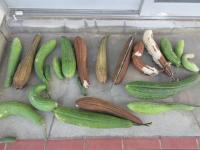 4年生が春に植えたヘチマが大きくなり、3階までつるがのびていました。実もたくさんできたので、収穫し片付けもました。種もたくさんできました。大きなヘチマにみんな大喜びでした。