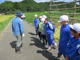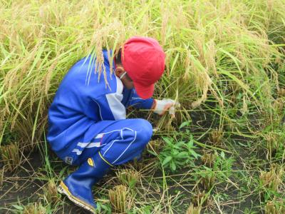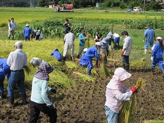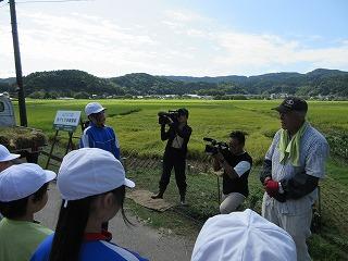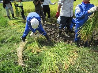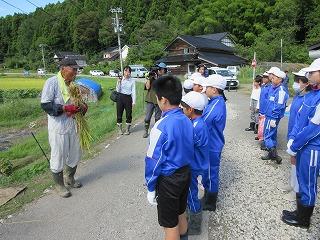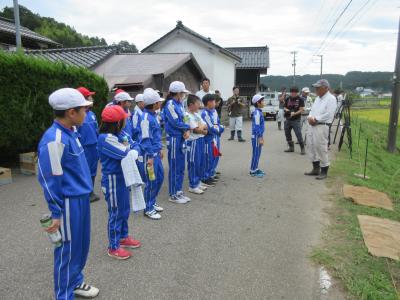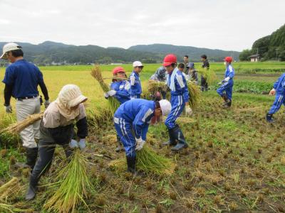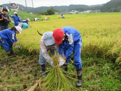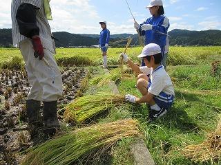 9月8日(金)に稲刈り体験をしました。4月24日に田植えをさせていただいた苗は、見事な稲穂に育っていました。6年生は今年で3回目とあって、どんどんやり方を思い出し、作業を進めることができました。今年初めての5年生も、「たかねをクラブ」の皆さんに刈る時の稲の握り方や刈った後の束ね方を丁寧に教えていただき、どんどん上手になっていきました。刈った束を藁で結ぶ方法も、「難しい」と言いながら、みんな頑張ってチャレンジしていました。