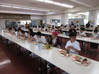 親子ドッチビーで汗を流し、給食試食会でお母さんお父さんと一緒に給食を食べました。