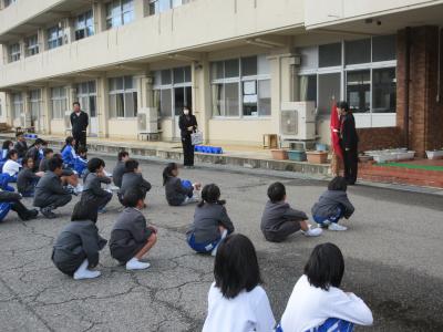 11月14日、地震・津波を想定した避難訓練がありました。今年度、初めての休み時間中の避難訓練でした。児童は、教室や体育館、図書館、廊下などそれぞれの場所で各自安全行動をとり、放送の指示に従って児童玄関前に避難をしました。