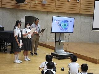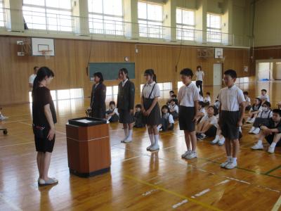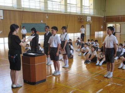 10月から後期児童会の活動が始まりました。全校集会で、後期の児童会長、各委員長の任命式がありました。それぞれがんばりたいことや今月のめあてをしっかりと発表することができました。後期の活動もみんなで協力してがんばっていきましょう。また、任命式の後に,養護教諭から「正しい姿勢」についてのお話がありました。姿勢は体だけでなく心にも影響します。「ペタ・ピン・グー」ができているか、自分の姿勢を振り返り、正しい姿勢になることを意識して過ごしましょう。